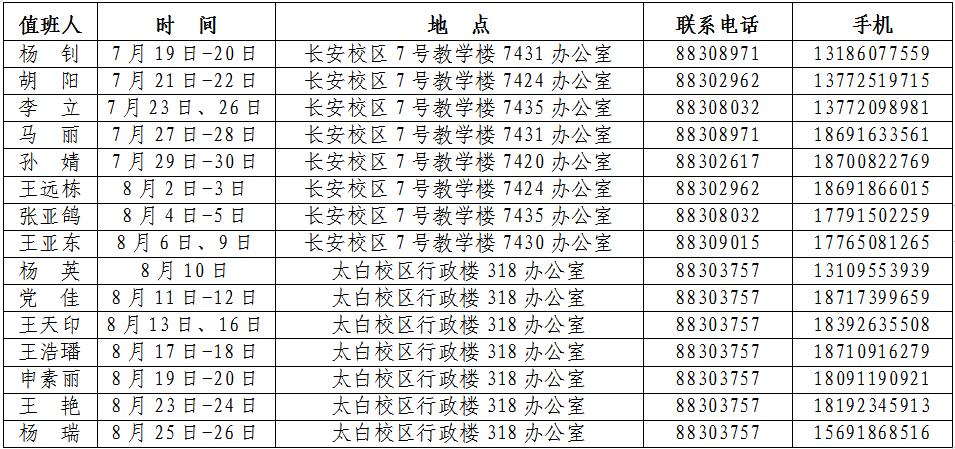 科技处2021年暑假值班安排 作者: 编辑:杨钊 时间:2021-07-18 根据学校安排,2021年暑假从7月19日至8月26日,8月27日(星期五)正式上班。 窗体顶端 窗体底端 一、值班安排 二、处领导带班时间 杨 涛:7月19日-23日、26日 翟高红:7月27日-30日、8月2日-3日 延绥宏:8月4日-6日、9日-11日 杜 凯:8月12日-13日、16日-19日 谢 钢:8月20 日、23日-26日 三、注意事项 值班时间为每天(周六、周日除外)上午 9:00~11:30,下午 2:30~5:00。 科 技 处 2021年7月18日