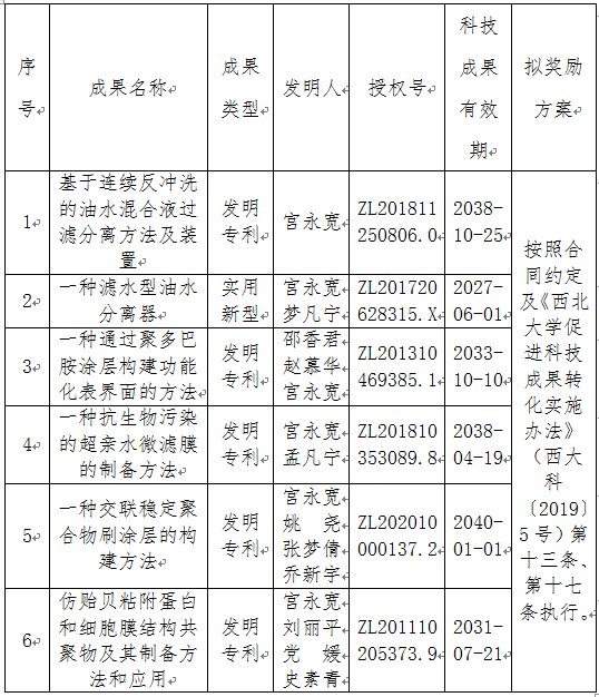 根据《伟德国际1949始于英国促进科技成果转化实施办法》(伟德科〔2019〕5号)相关规定,经学校科技成果转化工作小组、校长办公会审议,校党委常委会审定,拟对伟德化材学院宫永宽教授作为成果负责人的6项专利(5项发明专利和1项实用新型专利)权实施独占许可,现将相关信息公示如下: