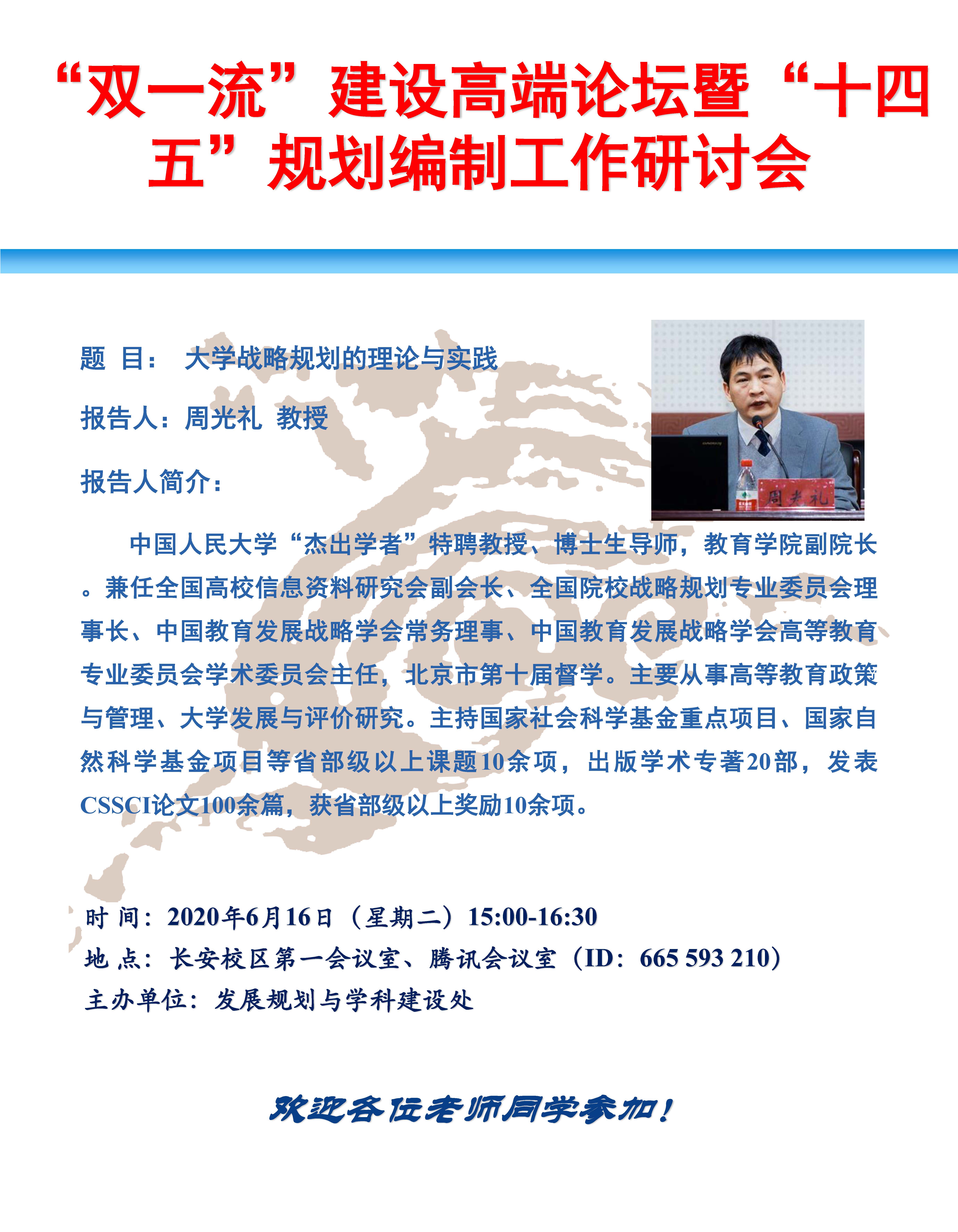 兹定于616日(星期二)下午15:00,在长安校区第一会议室、腾讯会议室(ID665 593 210),举行“双一流”建设高端论坛暨“十四五”规划编制工作研讨会,邀请高等教育规划专家、中国人民大学杰出学者特聘教授周光礼教授作“大学战略规划的理论与实践”的专题报告。