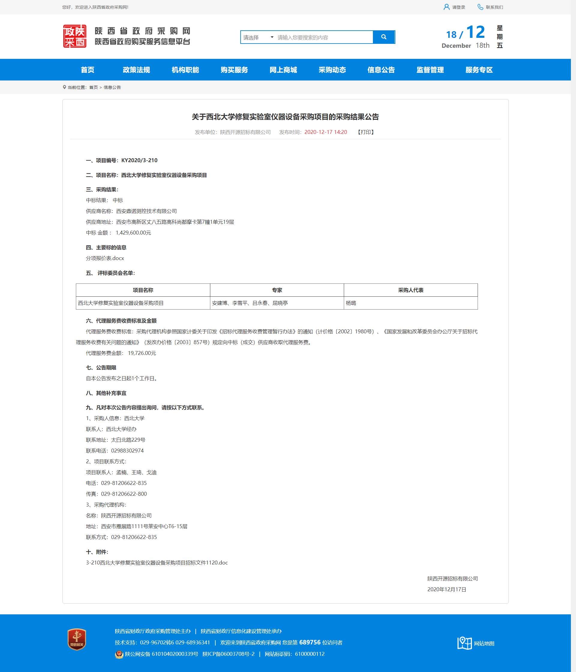 关于伟德国际1949始于英国修复实验室仪器设备采购项目的采购结果公告 作者: 编辑:薛利娟 时间:2020-12-18 原公告地址:http://www.ccgp-shaanxi.gov.cn/notice/noticeDetail.do?noticeguid=8a85be34765f9eac01766f3cbcd749f6