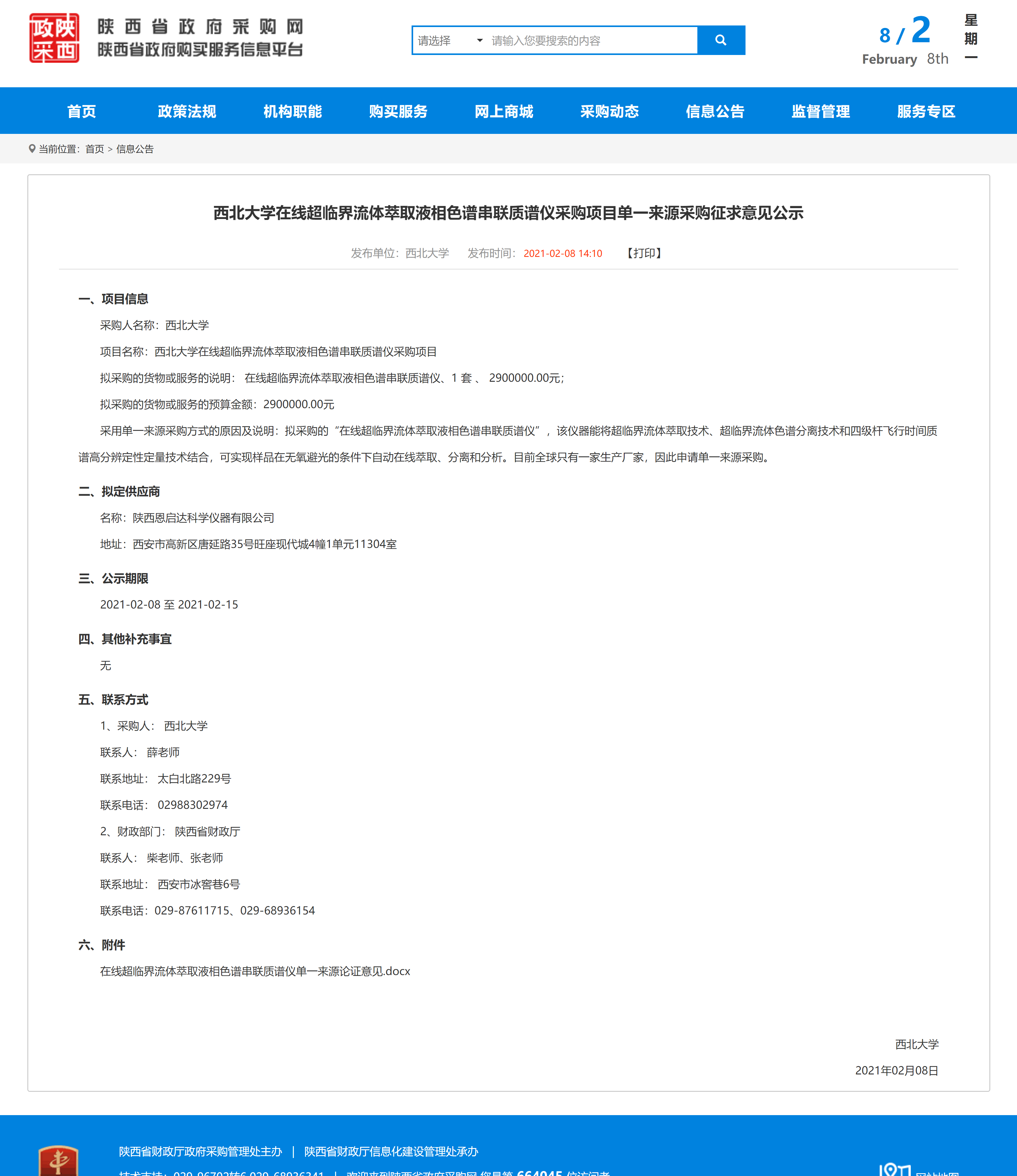 伟德国际1949始于英国在线超临界流体萃取液相色谱串联质谱仪采购项目单一来源采购征求意见公示