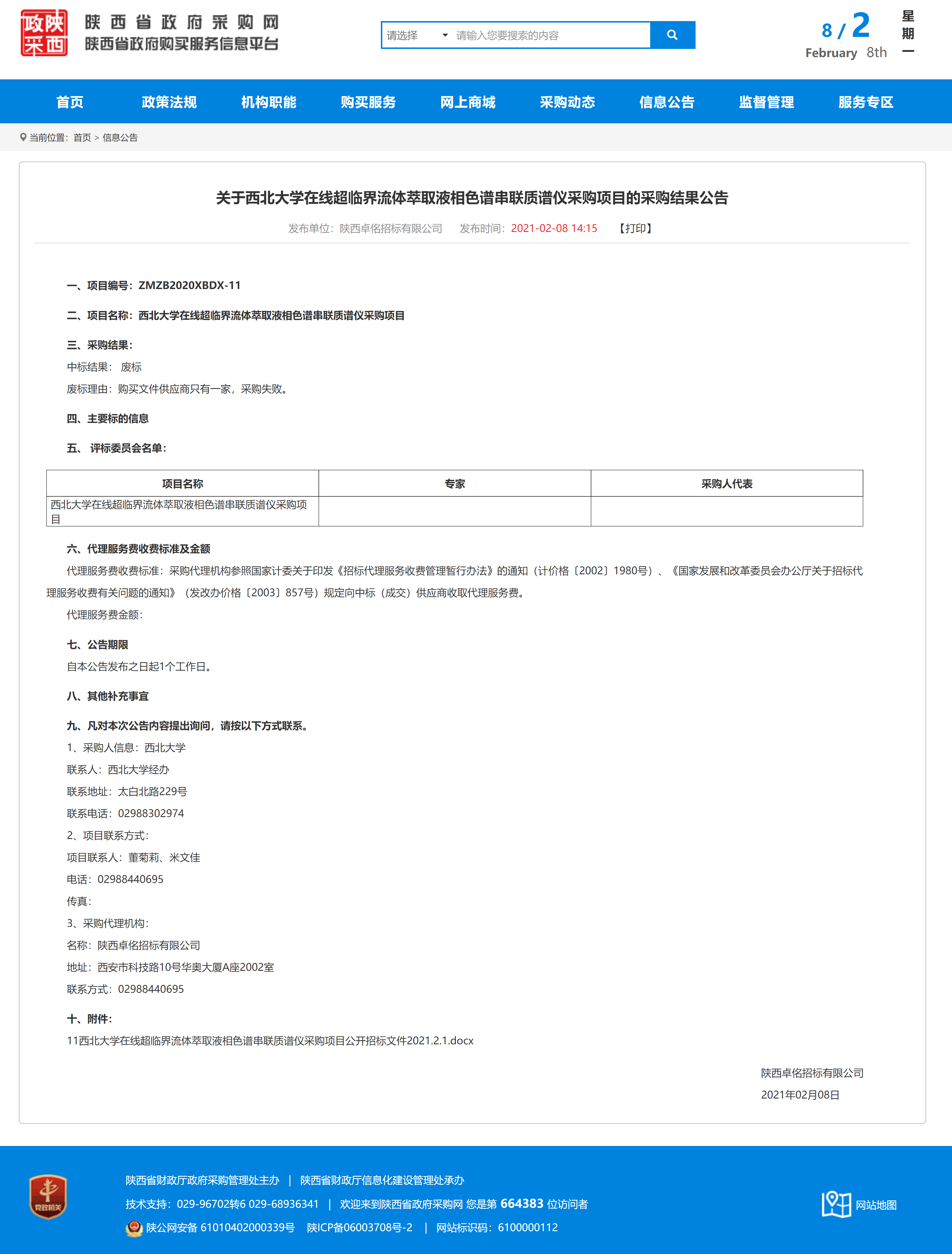 伟德国际1949始于英国在线超临界流体萃取液相色谱串联质谱仪采购项目的采购结果公告