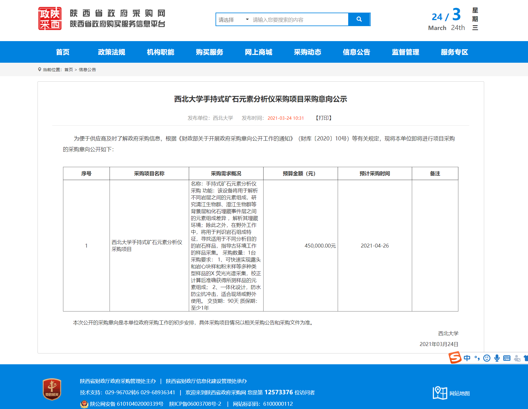 伟德国际1949始于英国手持式矿石元素分析仪采购项目采购意向公示