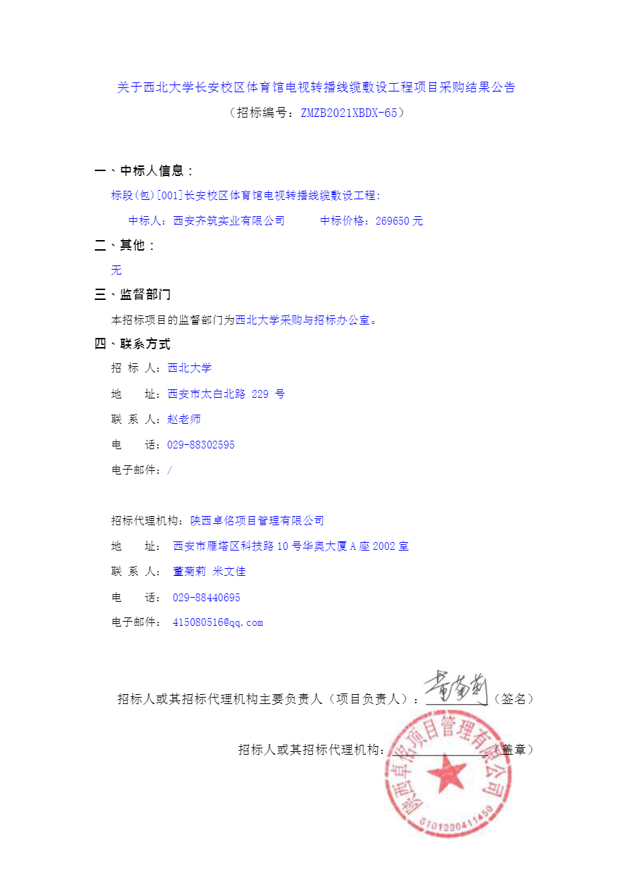 关于伟德国际1949始于英国长安校区体育馆电视转播线缆敷设工程项目采购结果公告