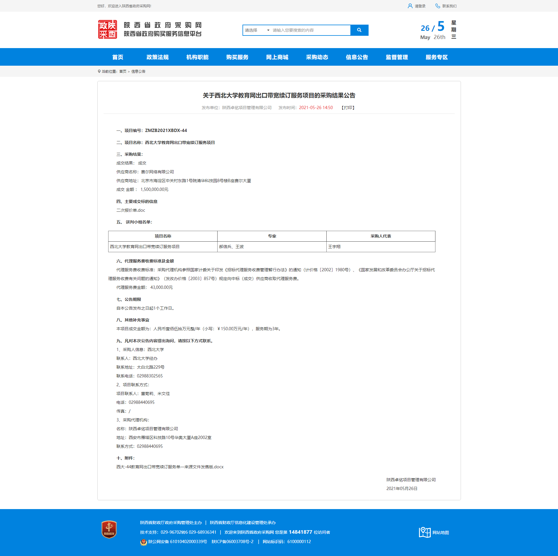 关于伟德国际1949始于英国教育网出口带宽续订服务项目的采购结果公告