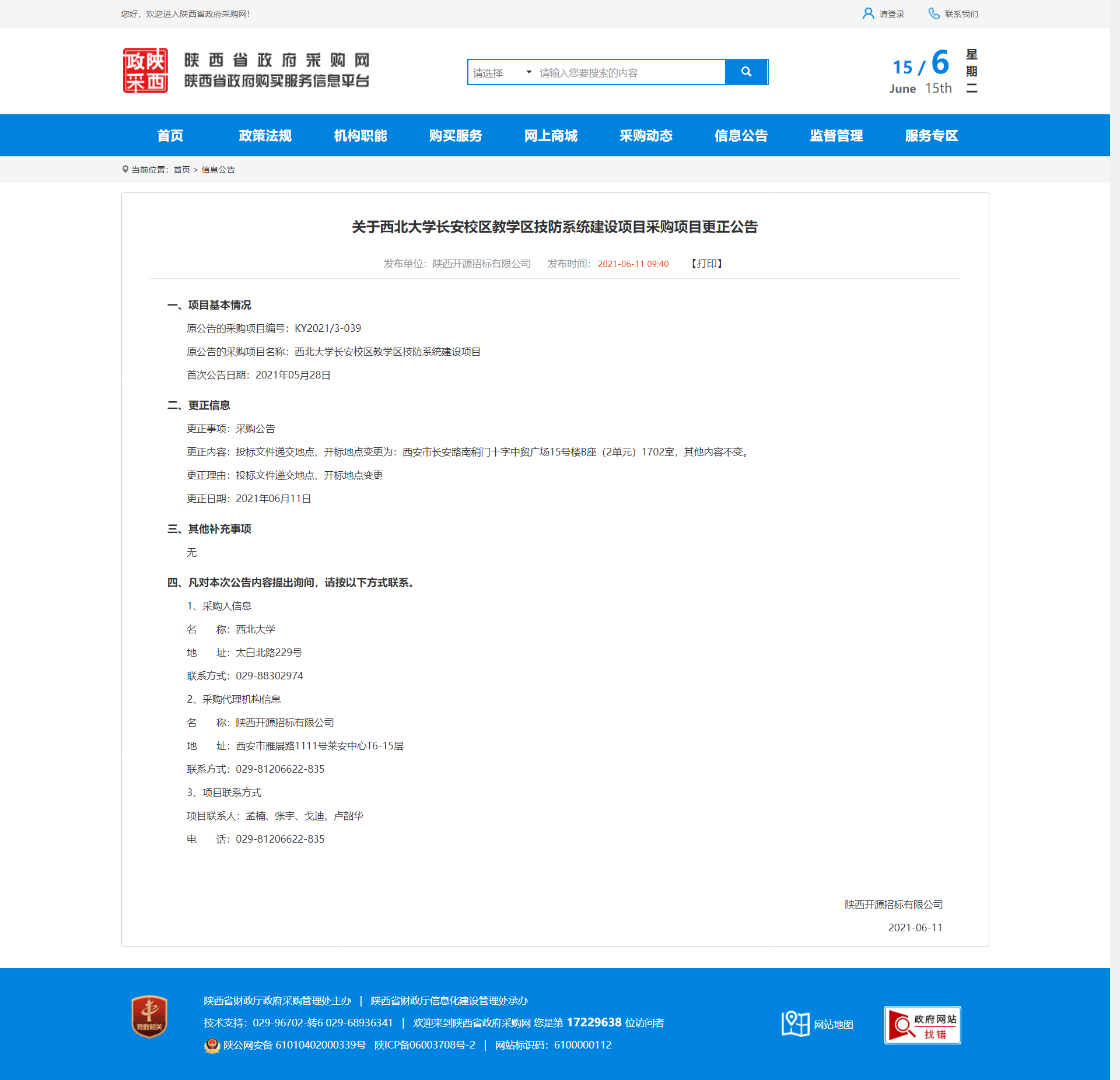 关于伟德国际1949始于英国长安校区教学区技防系统建设项目采购项目更正公告 作者: 编辑:薛利娟 时间:2021-06-15 原公告地址:http://www.ccgp-shaanxi.gov.cn/notice/noticeDetail.do?noticeguid=8a85be33791baa0f0179f8ab30151d42