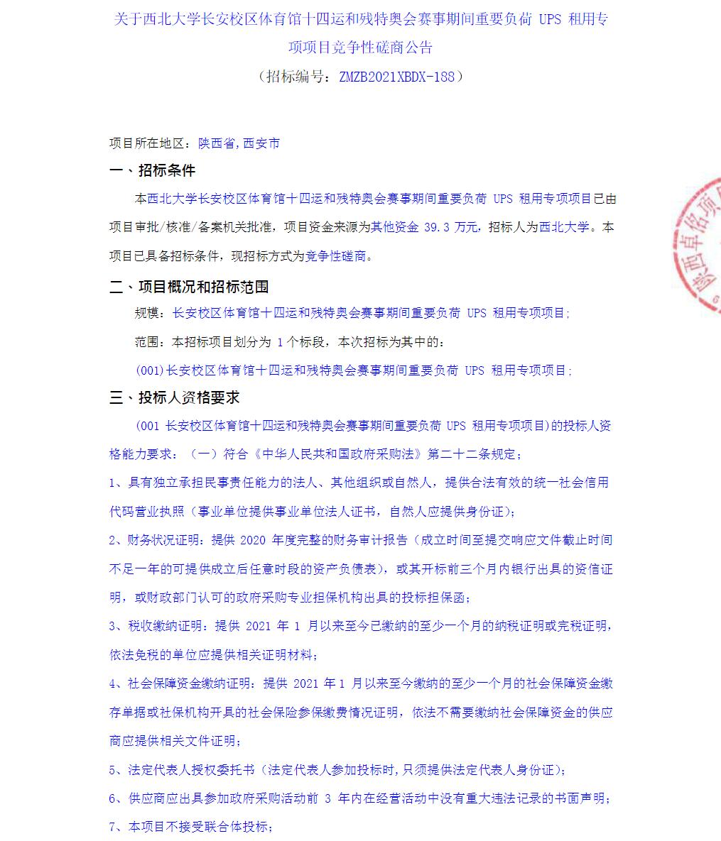 关于伟德国际1949始于英国长安校区体育馆十四运和残特奥会赛事期间重要负荷UPS租用专项项目竞争性磋商公告