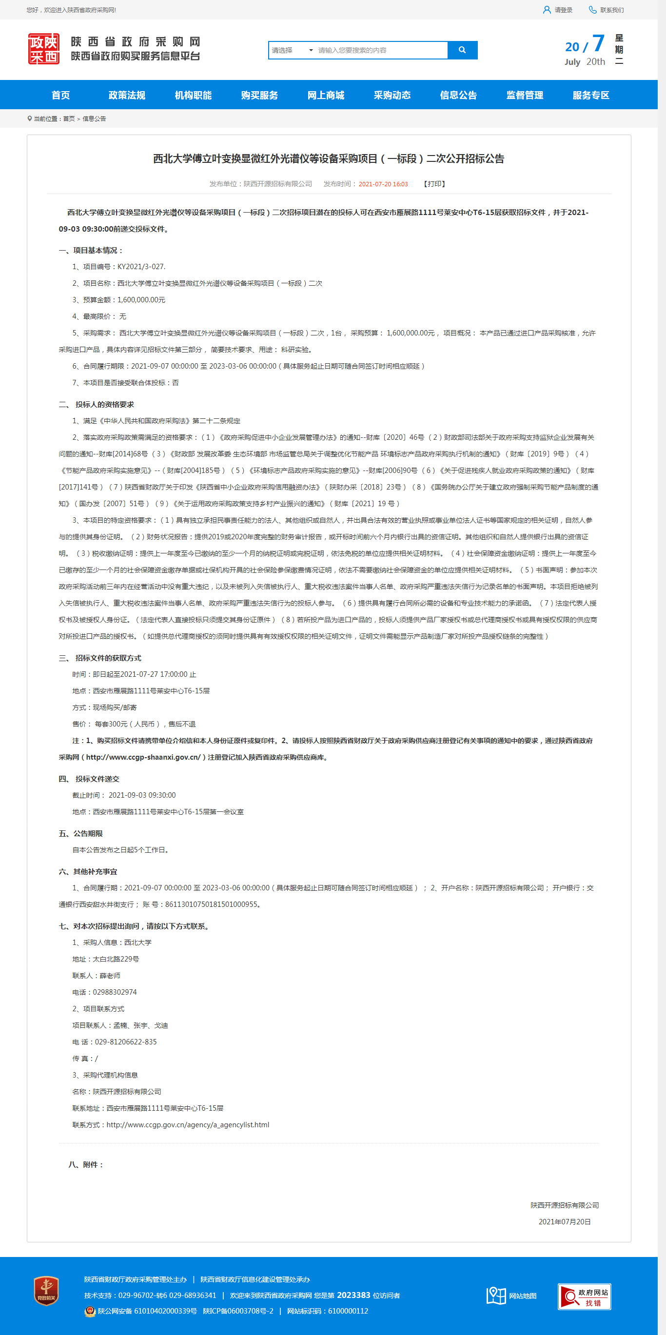 伟德国际1949始于英国傅立叶变换显微红外光谱仪等设备采购项目(一标段)二次公开招标公告 作者: 编辑:采购与招标办公室 时间:2021-07-20 原公告地址:http://www.ccgp-shaanxi.gov.cn/notice/noticeDetail.do?noticeguid=8a85be337a79620e017ac245c8027b46