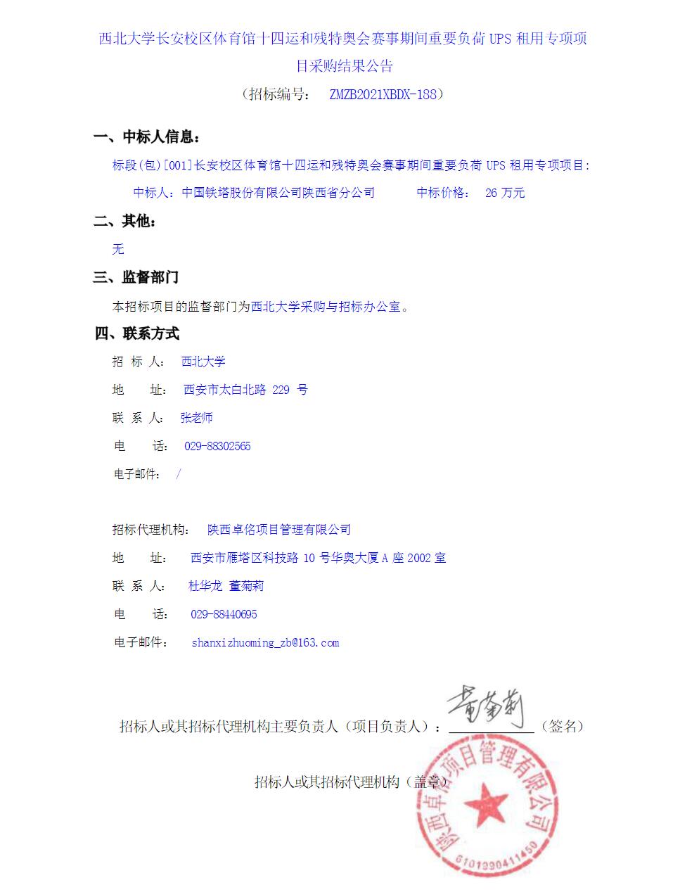 关于伟德国际1949始于英国长安校区体育馆十四运和残特奥会赛事期间重要负荷UPS租用专项项目采购结果公告