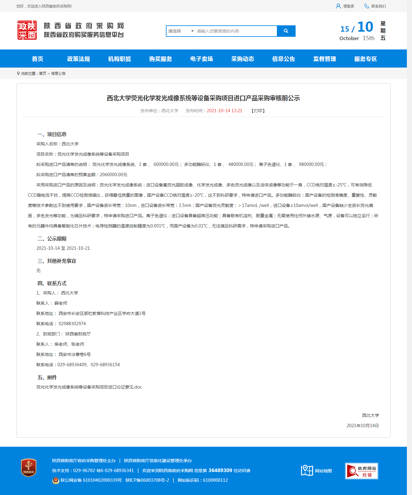 伟德国际1949始于英国荧光化学发光成像系统等设备采购项目进口产品采购审核前公示 作者: 编辑:采购与招标办公室 时间:2021-10-15 原公告地址:http://www.ccgp-shaanxi.gov.cn/notice/noticeDetail.do?noticeguid=8a85be327c20d508017c7d292ccd6e1a