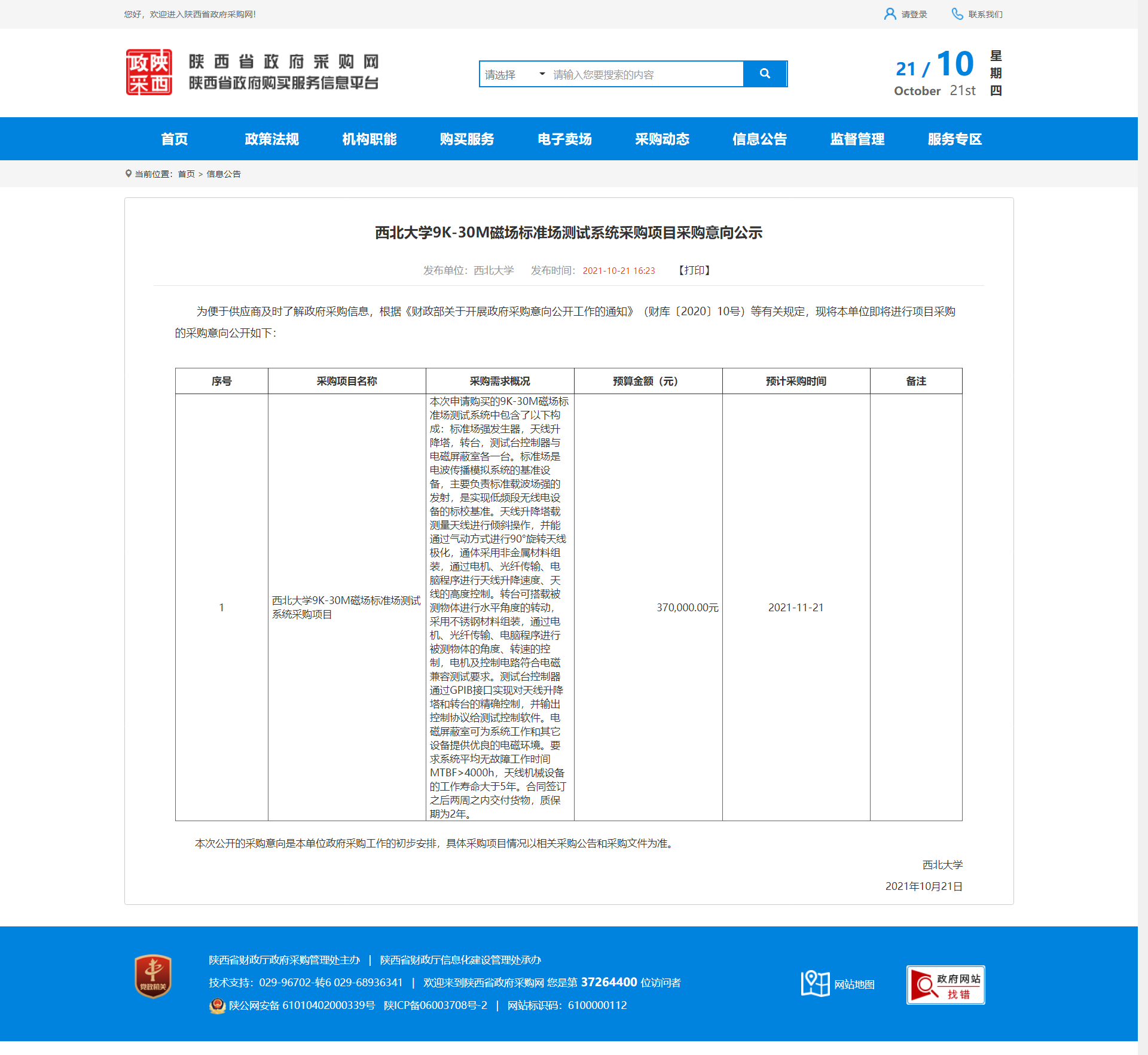 伟德国际1949始于英国9K-30M磁场标准场测试系统采购项目采购意向公示 作者: 编辑:采购与招标办公室 时间:2021-10-21 原公告地址:http://ccgp-shaanxi.gov.cn/notice/noticeDetail.do?noticeguid=8a85be337c20d0b4017ca1bd9ec34088