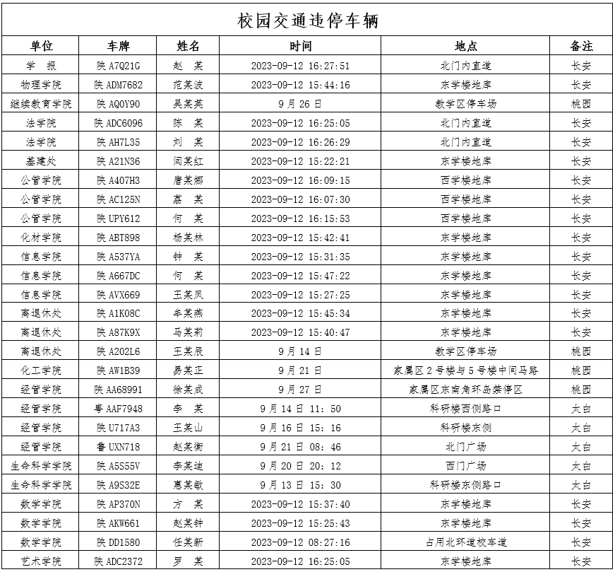 近期,省内部分高校因校内机动车行驶速度过快引发多起交通事故,造成师生员工人身、财产安全损失,教训极为深刻。为加强校内道路交通管理,规范校内交通秩序,根据《伟德国际1949始于英国校园道路交通管理办法》的通知要求,现将2023年9月11日至10月10日校园交通屡次违章车辆予以曝光,学校道路交通安全委员会决定,对多次违章车辆即日起禁止进入校园,并将违章车辆车主信息通报到所在单位,所在单位负责对师生进行交通安全教育和日常管理。
