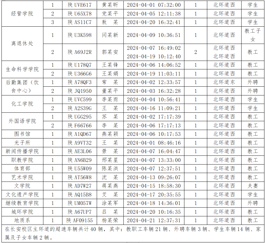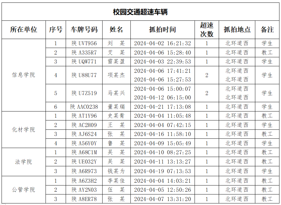 为加强校内道路交通安全管理,规范校内交通秩序,根据《伟德国际1949始于英国校园道路交通管理办法》有关要求,现将2024年4月校园交通违章车辆予以曝光,4月份教工超速车辆占52%、学生超速车辆占35%、外聘职工及教工家属车辆占12%,请所在单位加强对本单位违章师生员工的教育和管理,对于校内曝光超速的学生车辆将取消下一年度的通行证办理资格。