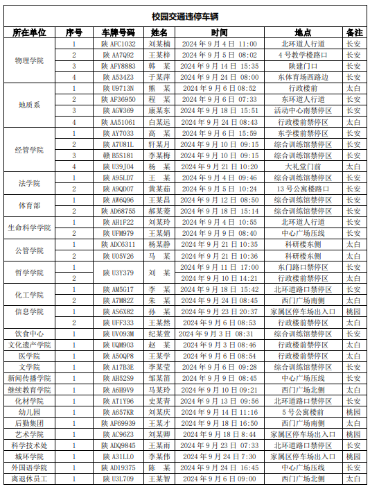 为一步加强校园交通管理,保障校园交通安全有序,维护学校正常的教学、科研和生活秩序以及师生员工的人身财产安全,根据《伟德国际1949始于英国校园交通安全管理规定》有关要求, 现将2024年9月校园交通违章车辆予以曝光,具体情况如下表。