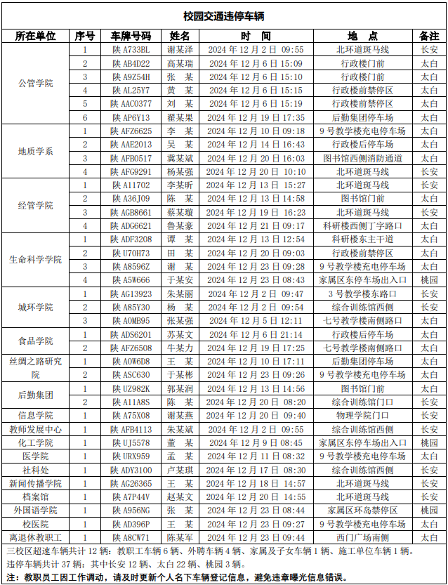 为进一步加强校园交通管理,保障校园交通安全有序,维护学校正常的教学、科研和生活秩序以及师生员工的人身财产安全,根据《伟德国际1949始于英国校园交通安全管理规定》有关要求, 现将2024年11月校园交通违章车辆予以曝光,具体情况如下表。