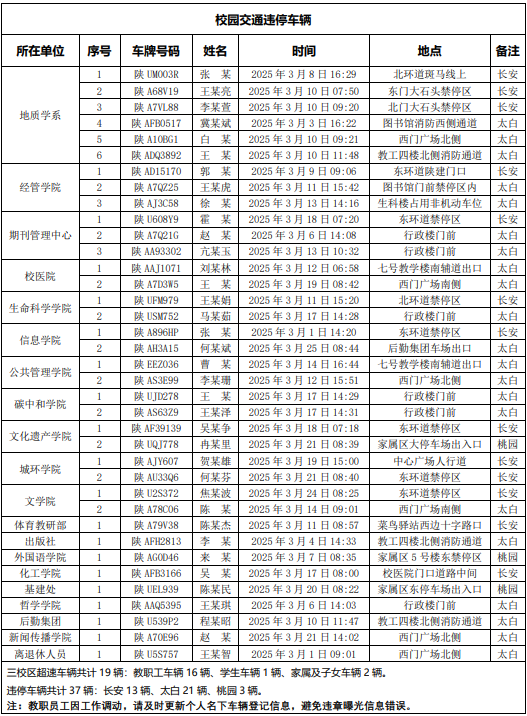 为进一步加强校园交通管理,保障校园交通安全有序,维护学校正常的教学、科研和生活秩序,切实保护师生员工的人身财产安全,根据《伟德国际1949始于英国校园交通安全管理规定》的相关要求,现将2025年3月校园交通违章车辆予以曝光,具体要求与违章信息如下:
