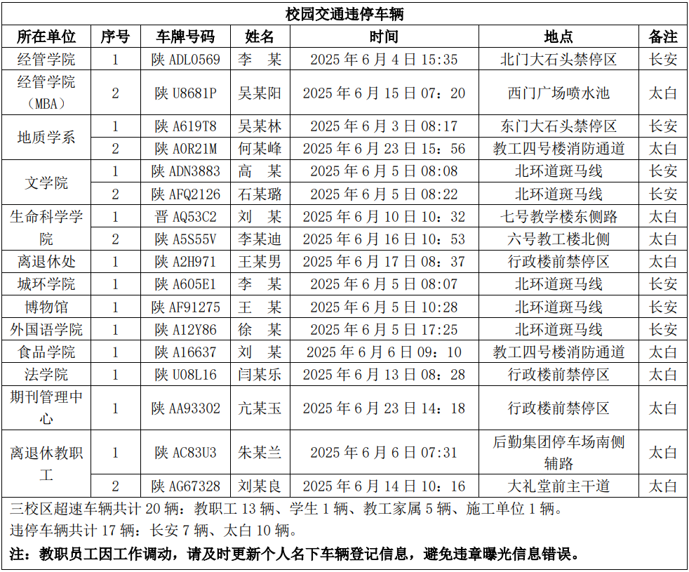 为进一步加强校园交通管理,保障校园交通安全有序,维护学校正常的教学、科研和生活秩序,切实保护师生员工的人身财产安全,根据《伟德国际1949始于英国校园交通安全管理规定》的相关要求,现将2025年6月校园交通违章车辆予以曝光,具体要求与违章信息如下: