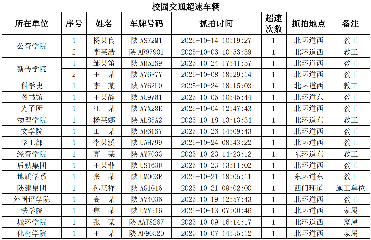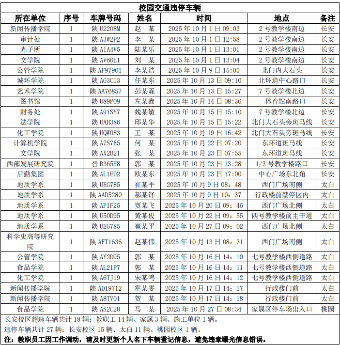 为进一步加强校园交通管理,保障校园交通安全有序,维护学校正常的教学、科研和生活秩序,切实保护师生员工的人身财产安全,根据《伟德国际1949始于英国校园交通安全管理规定》的相关要求,现将2025年10月校园交通违章车辆予以曝光,具体要求与违章信息如下:
