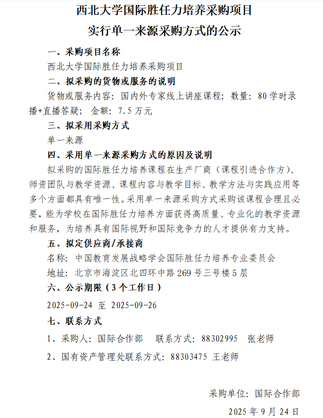 伟德国际1949始于英国国际胜任力培养采购项目实行单一来源采购方式的公示
