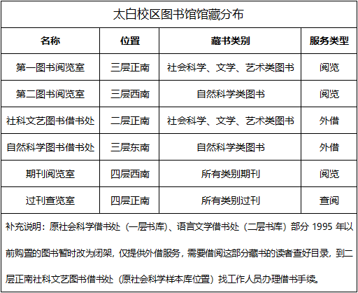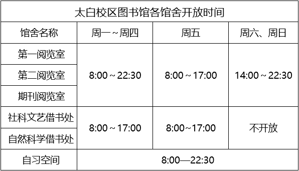 太白校区图书馆于11月30日(周一)起全面开馆,具体馆舍开放时间如下: