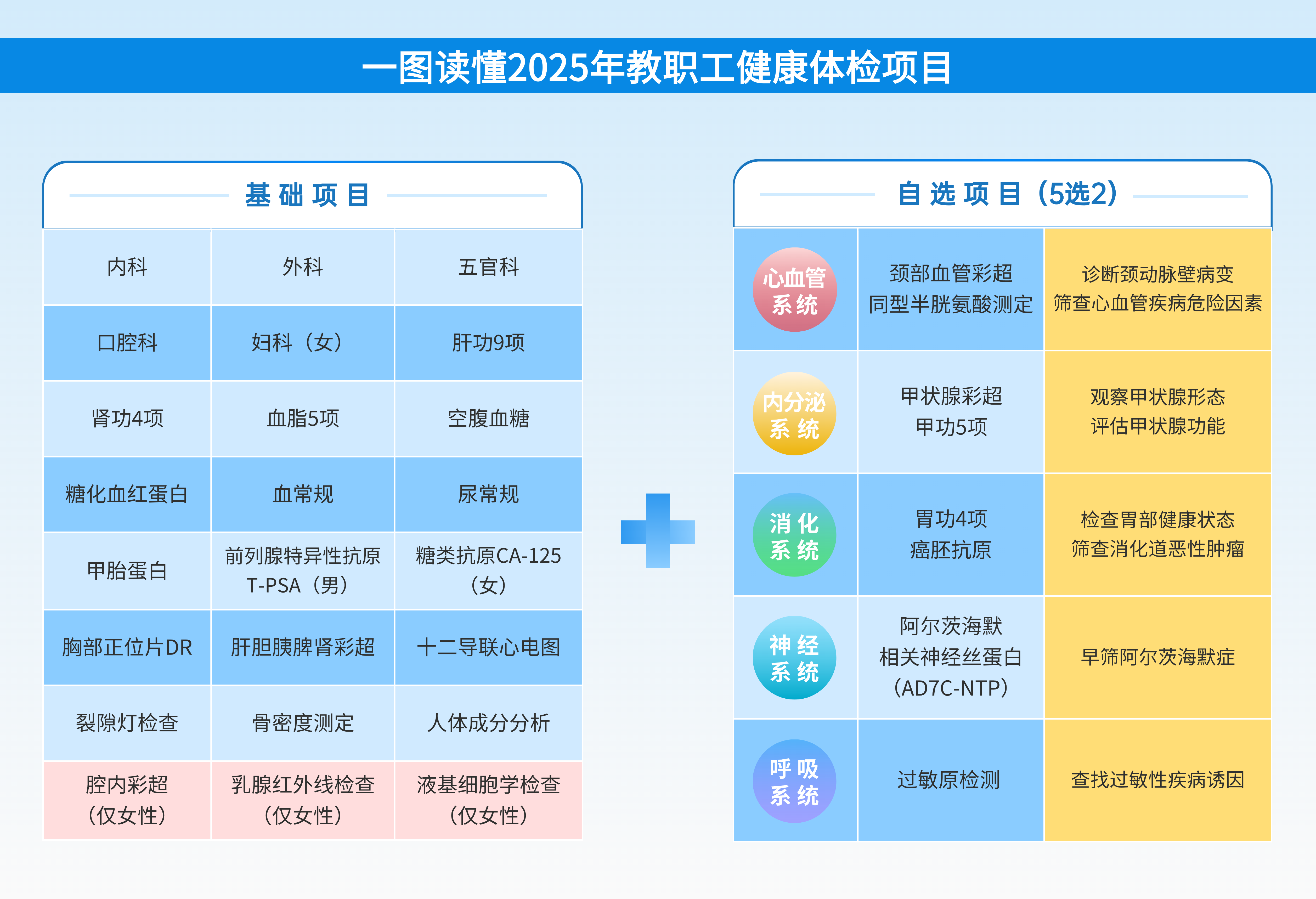 为更大限度满足教职工体检个性化需求,本年度教职工体检项目全面升级,创新“1+X”精准化体检模式,除基础项目外,参检教职工可根据自身健康情况在“心血管系统、内分泌系统、消化系统、神经系统、呼吸系统”五类自选项目中任选两类进行检查。