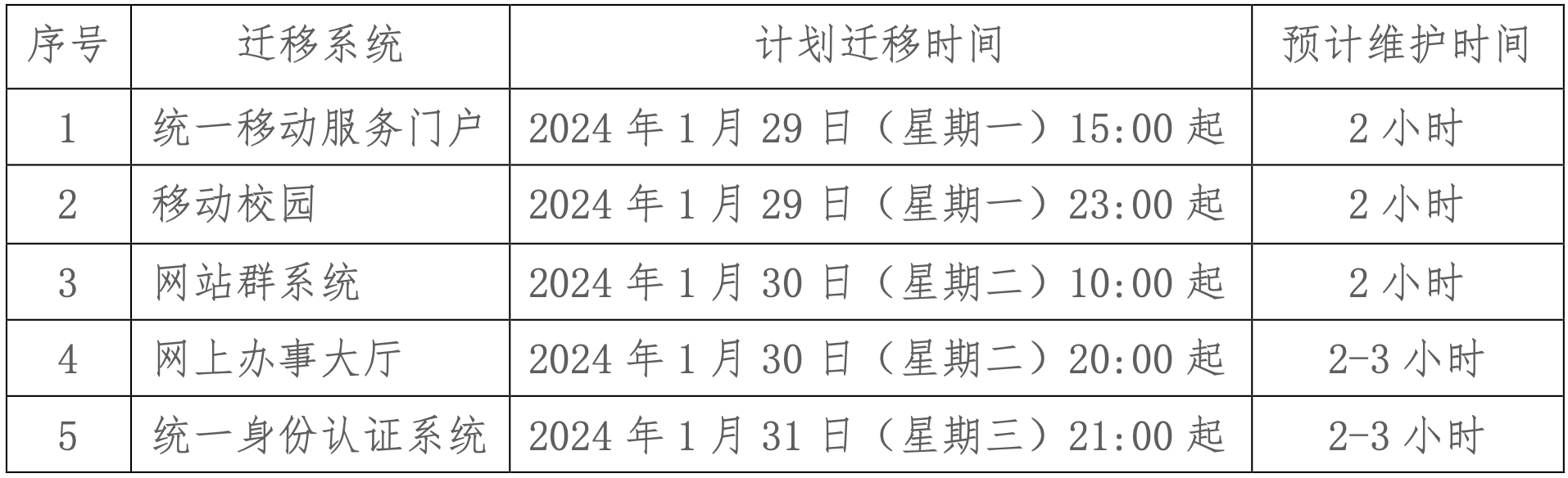 中心将于2024年1月29日(星期一)至1月31日(星期三)对学校网站群等系统进行迁移维护工作,具体迁移时间安排见下表。迁移维护期间各系统将暂停服务,敬请谅解。我们将尽最大努力缩短维护时间,并确保迁移工作的顺利进行。待迁移完成后,系统将恢复正常运行状态,为广大用户提供更加优质的服务。