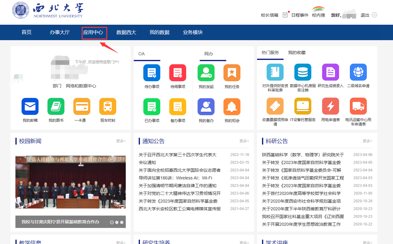 登录校园信息门户后,顶部导航栏选择“应用中心”。