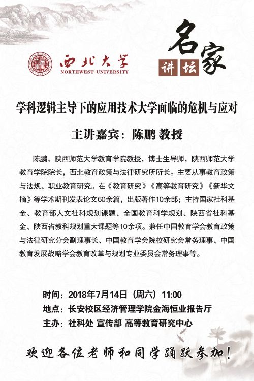 关于举办"名家讲坛"暨"高等教育论坛"(第十四期)的通知 作者: 编辑: 时间:2018-07-12 11:50 校内各有关单位:伟德国际1949始于英国名家讲坛暨高等教育论坛(第十四期)即将举行,现将具体情况通知如下:讲座题目:学科逻辑主导下的应用技术大学面临的危机与应对主讲嘉宾:陈 鹏 教授讲座时间:7月14日(周六)11:00讲座地点:伟德国际1949始于英国长安校区经济管理学院金海恒业报告厅主办单位:社科处、宣传部、高等教育研究中心欢迎各位老师和同学踊跃参加!