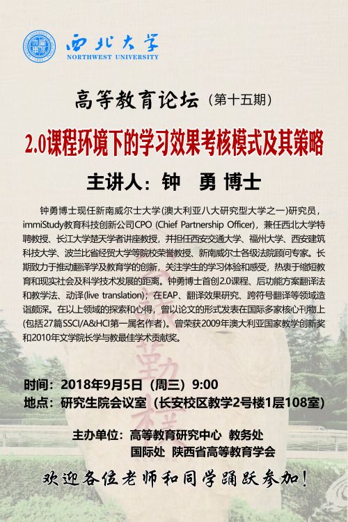 伟德国际1949始于英国"高等教育论坛"(第十五期) 作者: 编辑: 时间:2018-09-03 16:59 校内各有关单位: “高等教育论坛”第十五期即将举行,现将具体情况通知如下: 讲座题目:2.0课程环境下的学习效果考核模式及其策略主讲嘉宾:钟 勇 博士讲座时间:2018年9月5日(周三)上午9:00讲座地点:研究生院会议室(长安校区教学2号楼1层108室)主办单位:高等教育研究中心、教务处、国际处、陕西省高等教育学会欢迎各位老师和同学踊跃参加!窗体顶端联系人:伍小东 13891830894