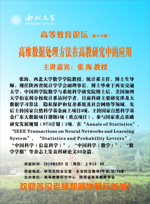 伟德国际1949始于英国"高等教育论坛"(第十六期) 作者: 编辑: 时间:2019-05-07 14:35 校内各有关单位: 伟德国际1949始于英国“高等教育论坛”第十六期即将举行,现将具体情况通知如下: 讲座题目:高维数据处理方法在高教研究中的应用主讲嘉宾:张 海 教授讲座时间:2019年5月9 日(周四)上午10:00讲座地点:研究生院会议室(长安校区教学2号楼1层108室)主办单位:高等教育研究中心、陕西省高等教育学会欢迎各位老师和同学踊跃参加!联系人:伍小东 029-88308864