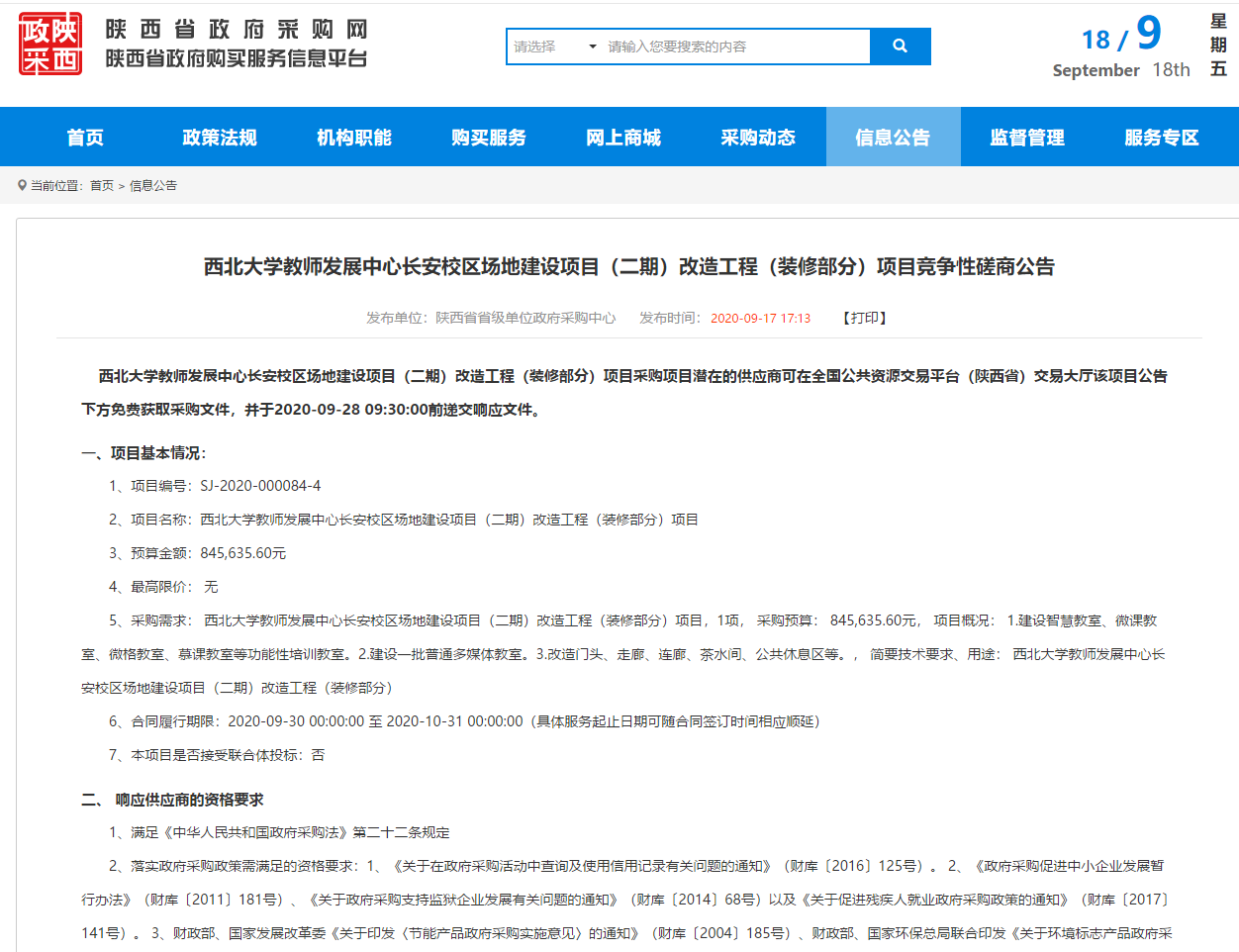 伟德国际1949始于英国教师发展中心长安校区场地建设项目(二期)改造工程(装修部分)项目竞争性磋商公告 作者: 编辑:季兴帅 时间:2020-09-18 公告原文链接:http://www.ccgp-shaanxi.gov.cn/notice/noticeDetail.do?noticeguid=8a85be327394d739017499e718111004