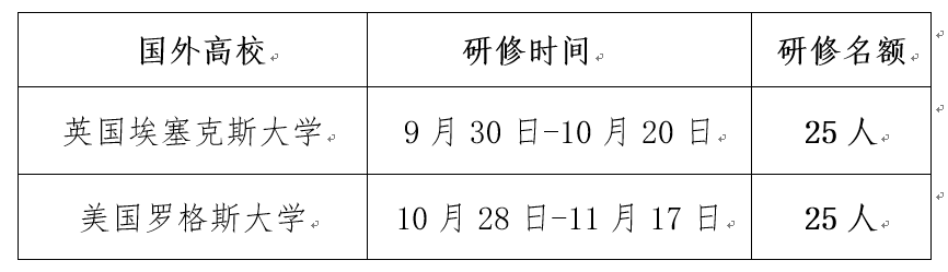 为进一步提升伟德中青年教师国际化视野,加强对外交流与合作,有效提升教学能力与水平,提高人才培养质量,助推“双一流”建设。教师发展中心拟定于2018年9月至11月组织相关学科优秀中青年教师赴英国埃塞克斯大学和美国罗格斯大学进行教学专题研修,现面向校内相关专业遴选优秀中青年教师,具体事宜如下: