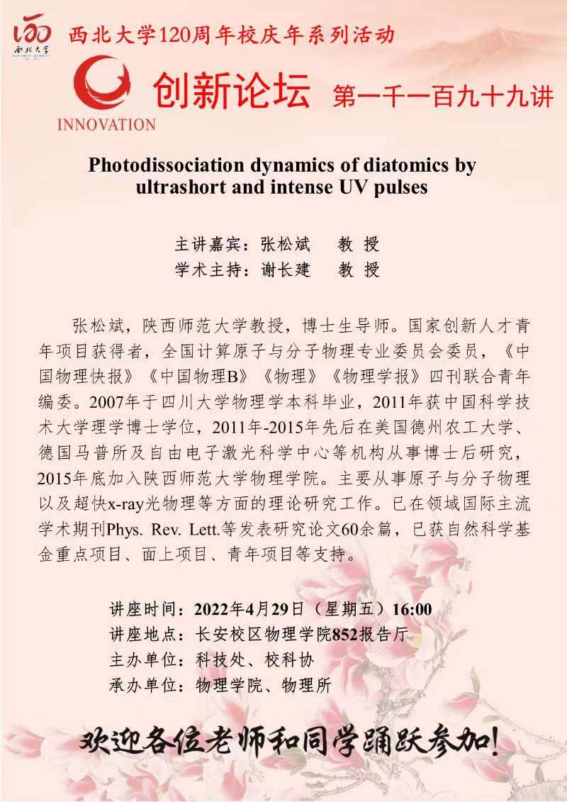 伟德国际1949始于英国创新论坛第一千一百九十九讲暨120周年校庆年系列活动:Photodissociation dynamics of diatomics by ultrashort and intense UV pulses 作者:张松斌 教授 编辑:杨钊 时间:2022-04-26