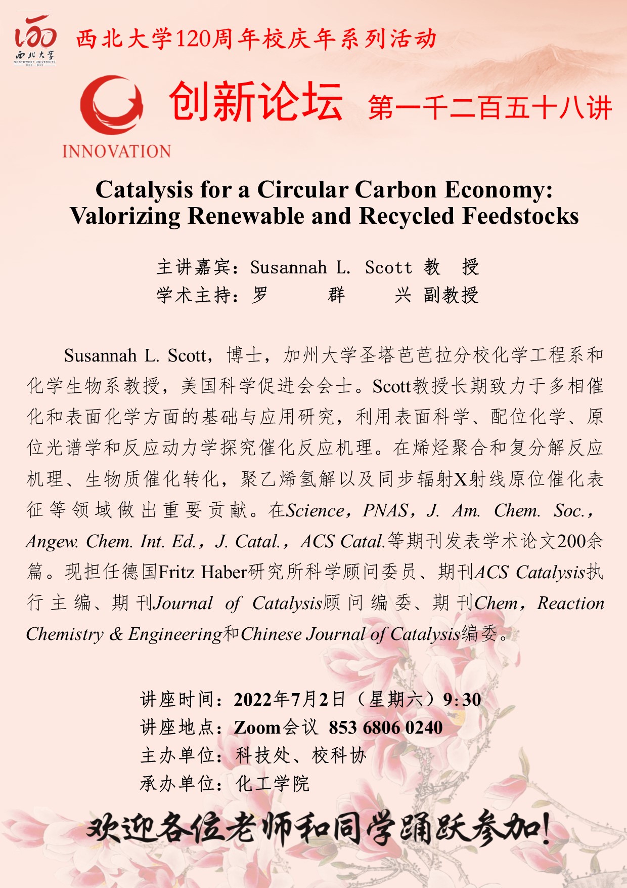 伟德国际1949始于英国创新论坛第一千二百五十八讲暨120周年校庆年系列活动:Catalysis for a Circular Carbon Economy: Valorizing Renewable and Recycled Feedstocks 作者:Susannah L. Scott 教授 编辑: 时间:2022-06-30