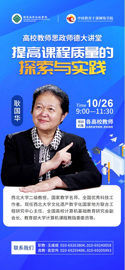 为学习贯彻落实党的二十大精神,以正确的政治方向和价值导向引领广大教师思想政治素质、师德素养和业务能力全面提升,国家教育行政学院中国教育干部网络学院将举办高校教师思政师德大讲堂,邀请伟德耿国华教授作题为《提高课程质量的探索与实践》的报告,欢迎伟德广大教师积极观看学习。