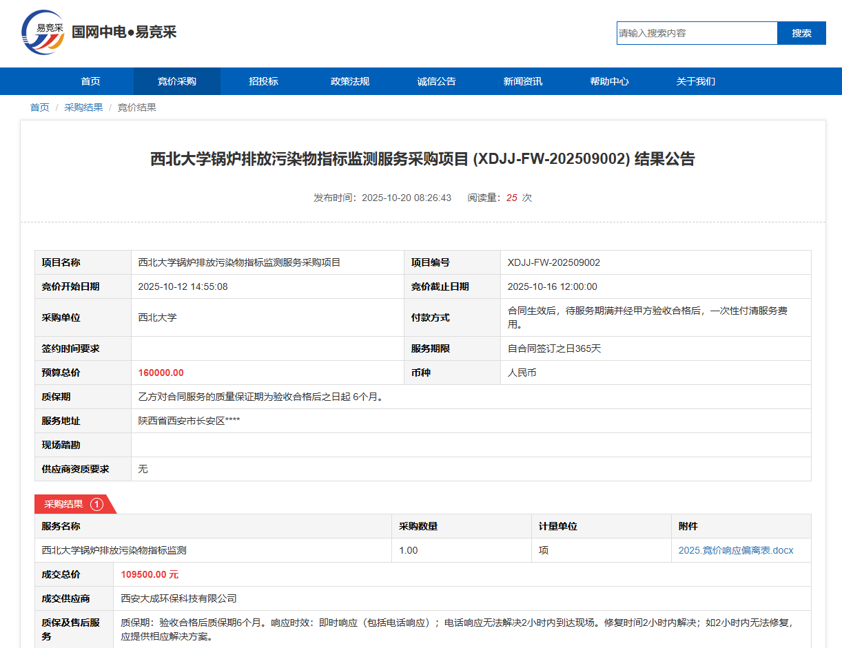 伟德国际1949始于英国锅炉排放污染物指标监测服务采购项目(XDJJ-FW-202509002)竞价结果公告