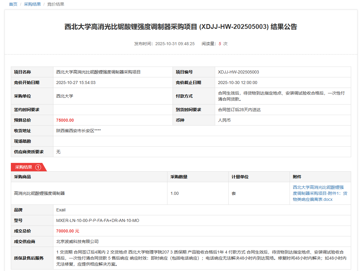 伟德国际1949始于英国高消光比铌酸锂强度调制器采购项目(XDJJ-HW-202505003)竞价结果公告