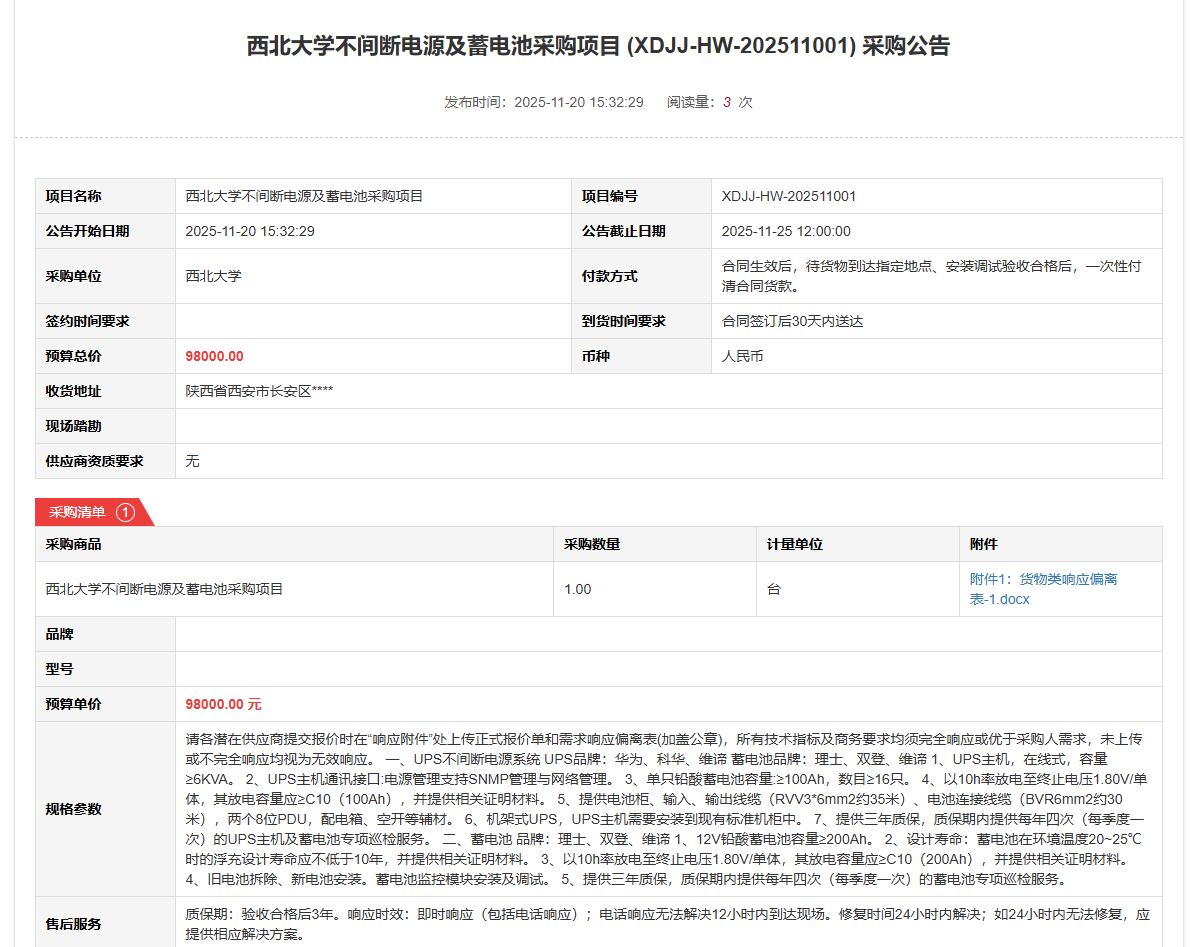 伟德国际1949始于英国不间断电源及蓄电池采购项目(XDJJ-HW-202511001)竞价采购公告