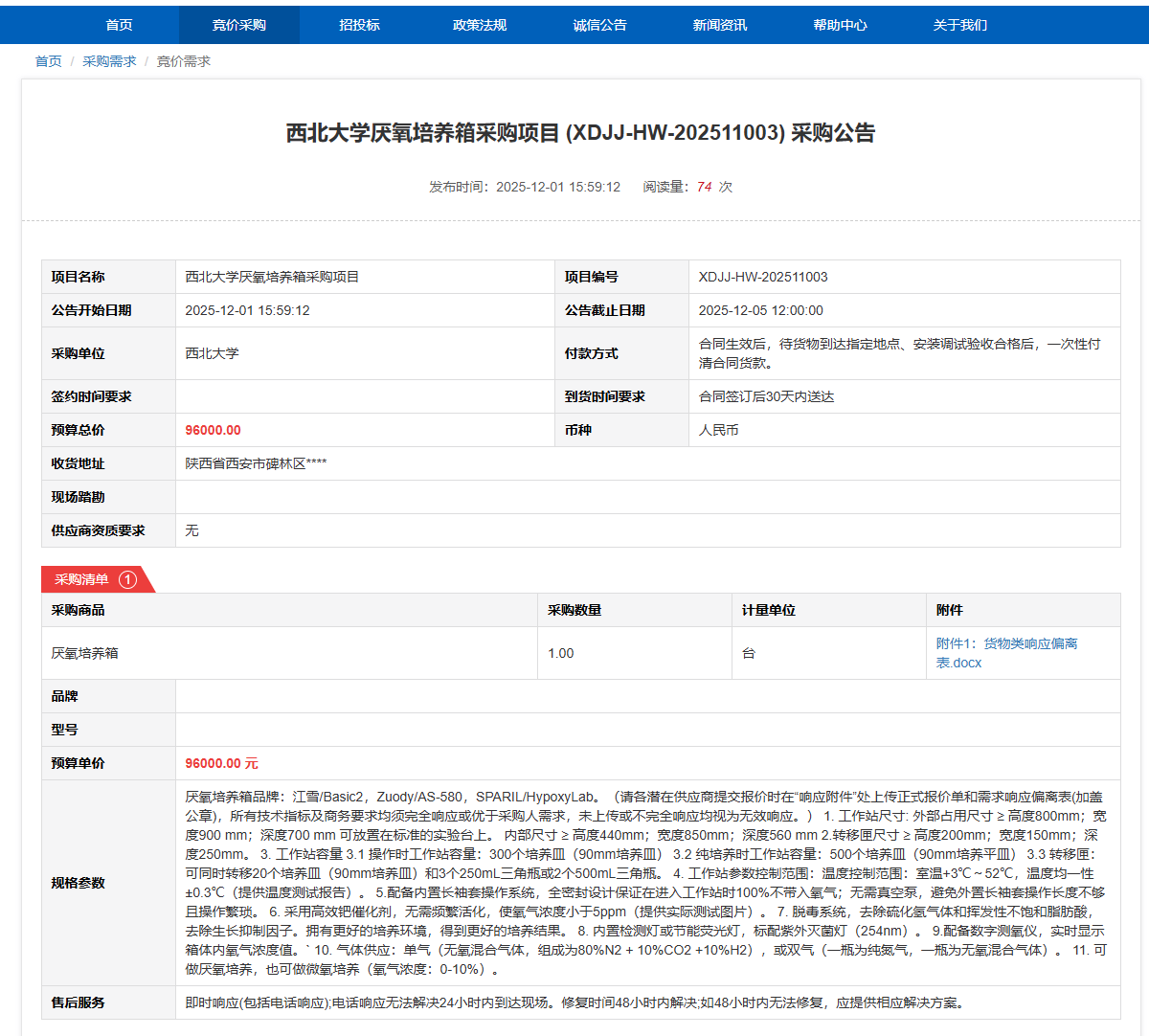 伟德国际1949始于英国厌氧培养箱采购项目(XDJJ-HW-202511003)竞价采购公告