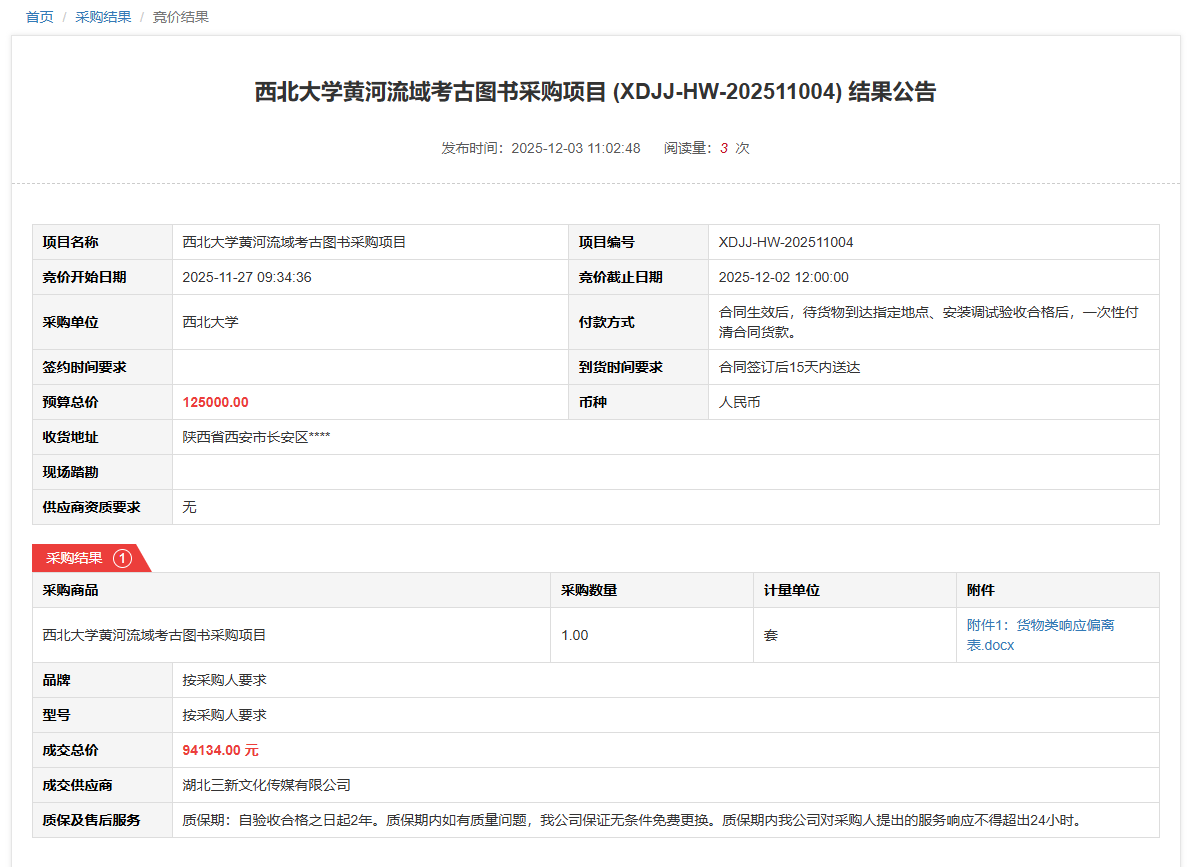 伟德国际1949始于英国黄河流域考古图书采购项目(XDJJ-HW-202511004)竞价结果公告