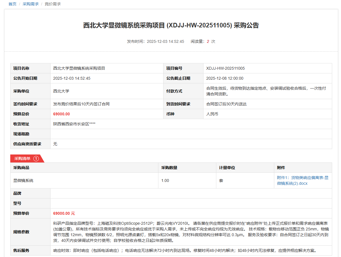 伟德国际1949始于英国显微镜系统采购项目(XDJJ-HW-202511005)竞价采购公告